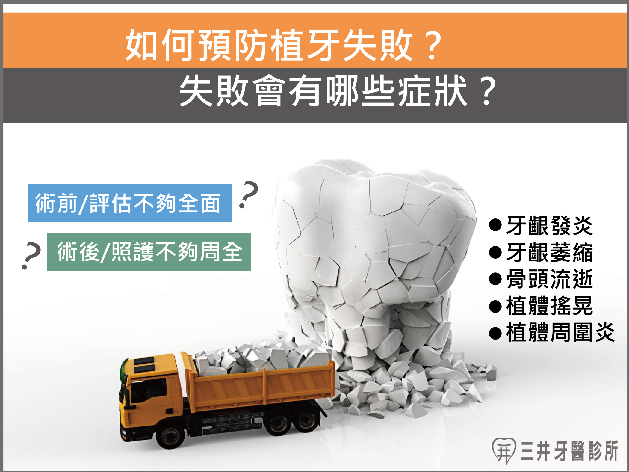 植牙失敗的原因有很多種,可能是術前評估不夠全面,或是術後照護不夠周全,傷口感染引起植體周圍炎等導致植牙失敗,另外有些隱患又是肉眼檢查不出來的,所以植牙後定期回診檢查相當重要,倘若在日常生活中出現這些症狀,建議盡速至牙醫診所檢查,若不盡早治療,很可能造成不可逆的影響,甚至影響到周邊的健康牙齒。
