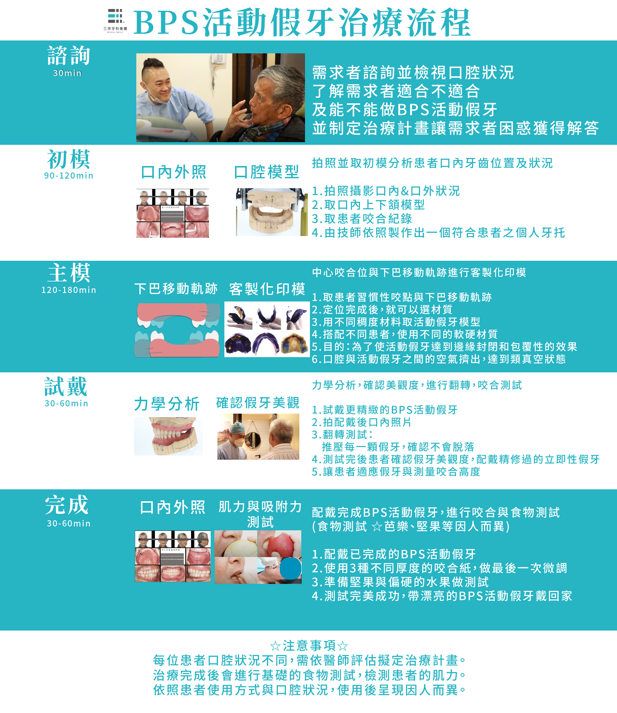 活動假牙治療流程說明,詳述療程每個步驟治療重點。