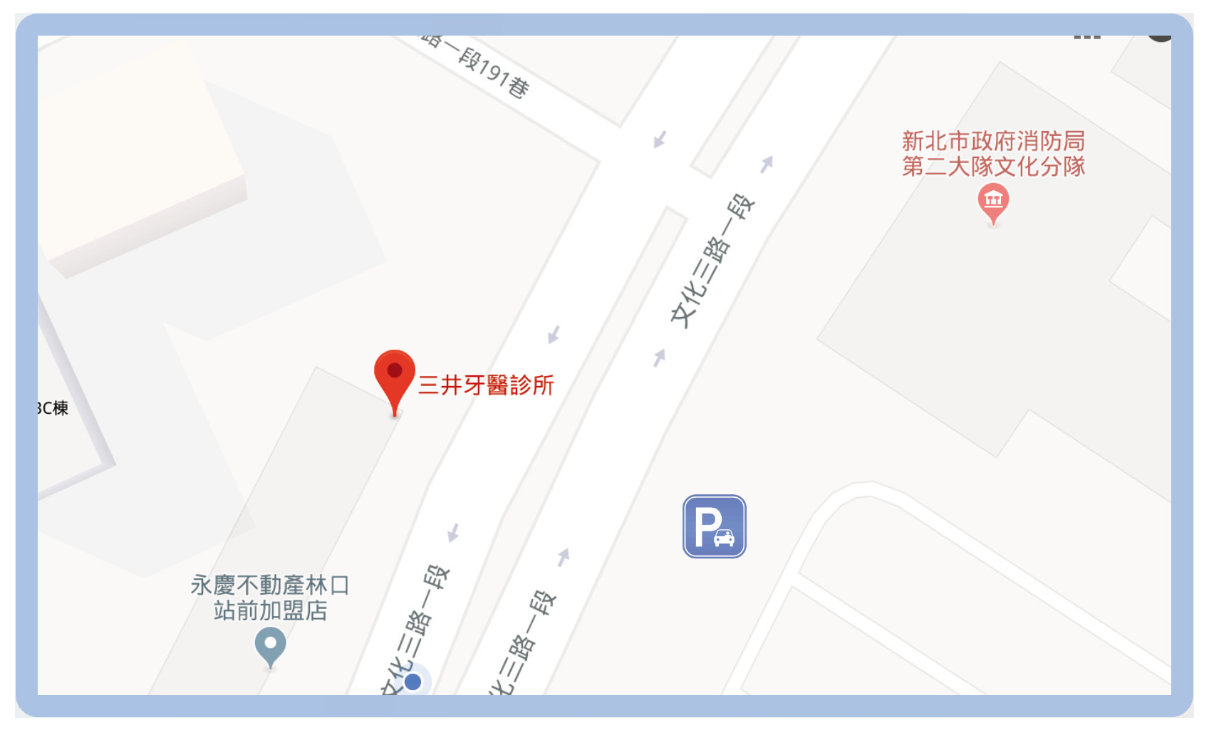 交通資訊 首頁 聯絡我們 交通資訊 對面為平面停車場 【自行開車】 國道一號 北上 下林口B交流道,直行至文化三路口左轉,直行至文化三路一段179號,即可抵達三井牙醫診所 國道一號 南下 下林口A交流道,直行至文化三路口右轉,直行至文化三路一段179號,即可抵達三井牙醫診所 【公車-行政園區】 854、898、936、937、945、946、948、F232、F237,下車後步2分鐘 【桃園機場捷運】 捷運林口站出口後,往三井outlet方向直行約5分鐘即可抵達本診所